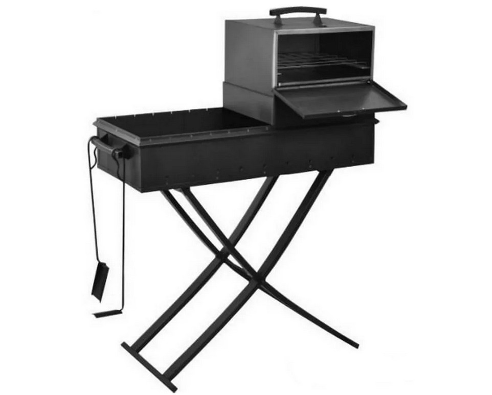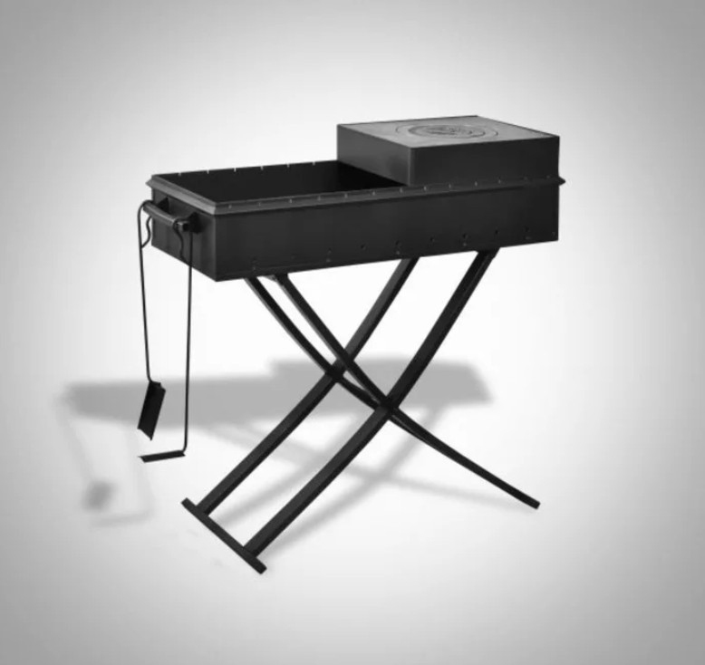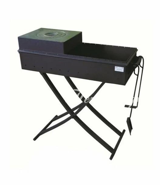 Мангал состоит из «коробки» и съемных опор (ножек), которые легко устанавливаются и снимаются. Очень надежный без излишеств вариант для любителей практичных вещей.