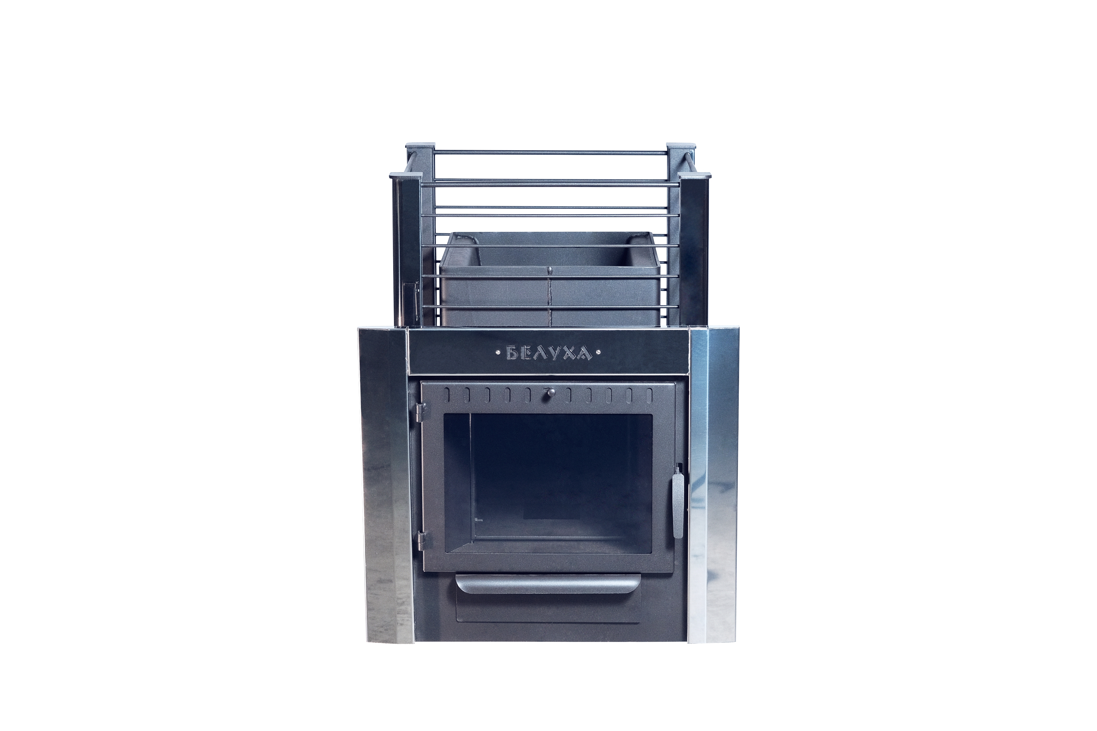 Печь "Белуха" оснащена выносным топливным каналом и панорамным термостойким стеклом, позволяющим наблюдать за процессом горения и топить печь из смежного помещения.