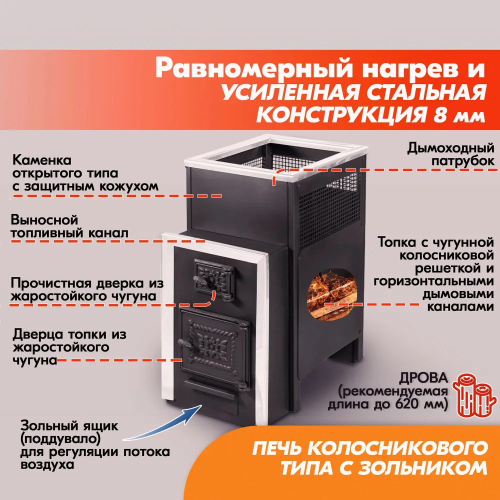 Печь банная Радуга ПБ-30Б дровяная имеет удобную конструкцию и очень вместительное отделение для топки, обеспечивает быстрый и равномерный нагрев бани.