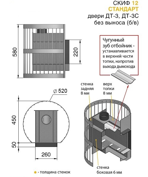 Банная печь Скиф Ч укомплектована топочной глухой чугунной дверцей и имеет конвекционно-вентилируемый кожух (сетка), который изготовлен из калиброванного прута диаметром 6 мм. Дровяная печь Везувий Скиф 12 Ч рассчитана на объем парильного помещения 6-14 м3. В конструкции данной печи не предусмотрен топочный тоннель, что позволяет топить её прямо из парильного помещения.