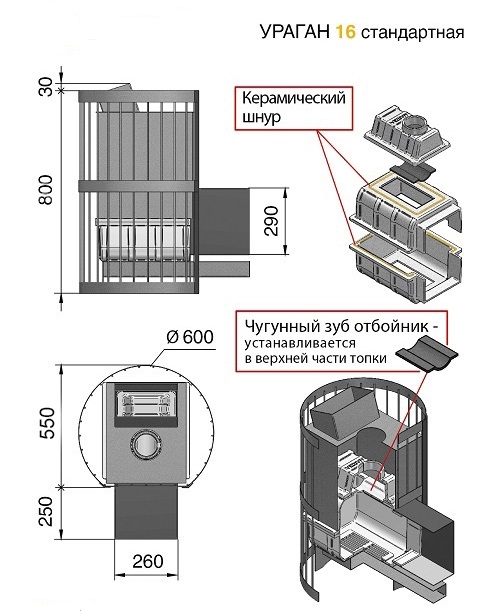 Преимущество печи в том, что она состоит из 3-х элементов. На стыке между ними используется керамический шнур с рабочей температурой 1200 градусов. То есть топка печи абсолютно герметична! Для фиксации деталей между собой применяется болтовое соединение, что даёт 100% гарантию безопасности при эксплуатации.