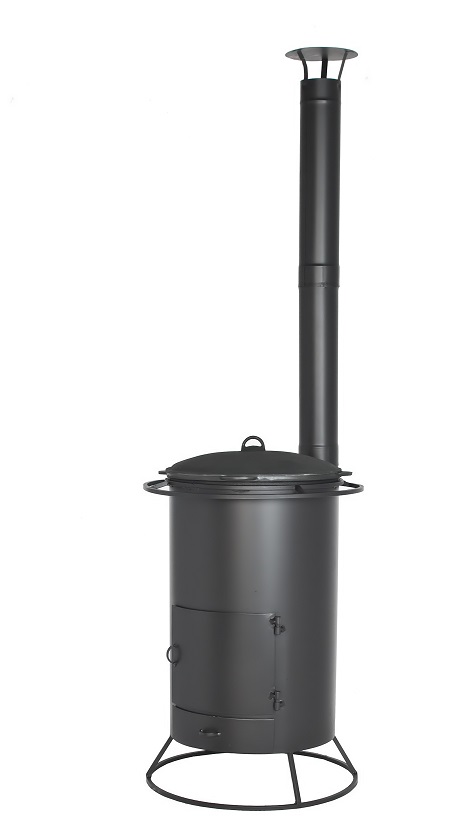 Печь под казан с трубой большая предназначена для приготовления пищи под открытым небом, благодаря тому, что печь под казан имеет высокую вытяжную трубу самоварного типа. Дым, выходящий из трубы, не мешает окружающим. Колосниковая решётка, выполненная из чугуна, выдвижным зольным ящиком позволяет удалить золу при работающей печи. Так же выдвижной зольный ящик дает возможность регулировать интенсивность горения дров в топке.