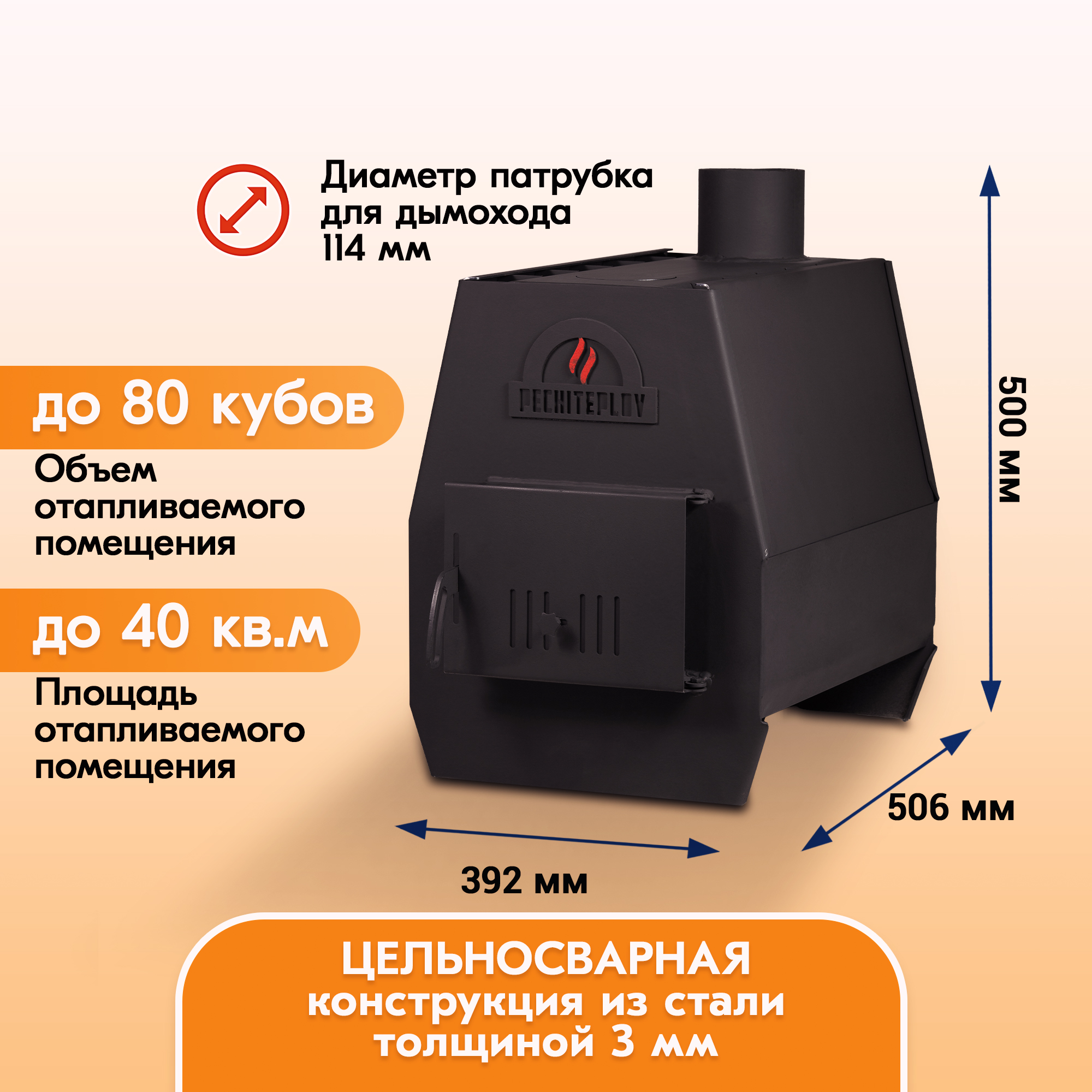 Печи отопительные PECHITEPLOV на 50 и 80 кубов, имеют компактные размеры и небольшую массу, поэтому их легко переместит с места на место и смонтирует один рабочий.